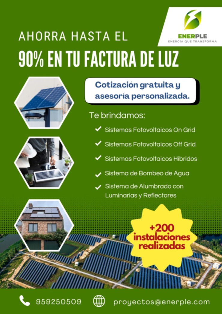 ¿Cansado de pagar luz carísima? Con ENERPLE puedes ahorrar hasta 90% instalando energía solar desde ya.